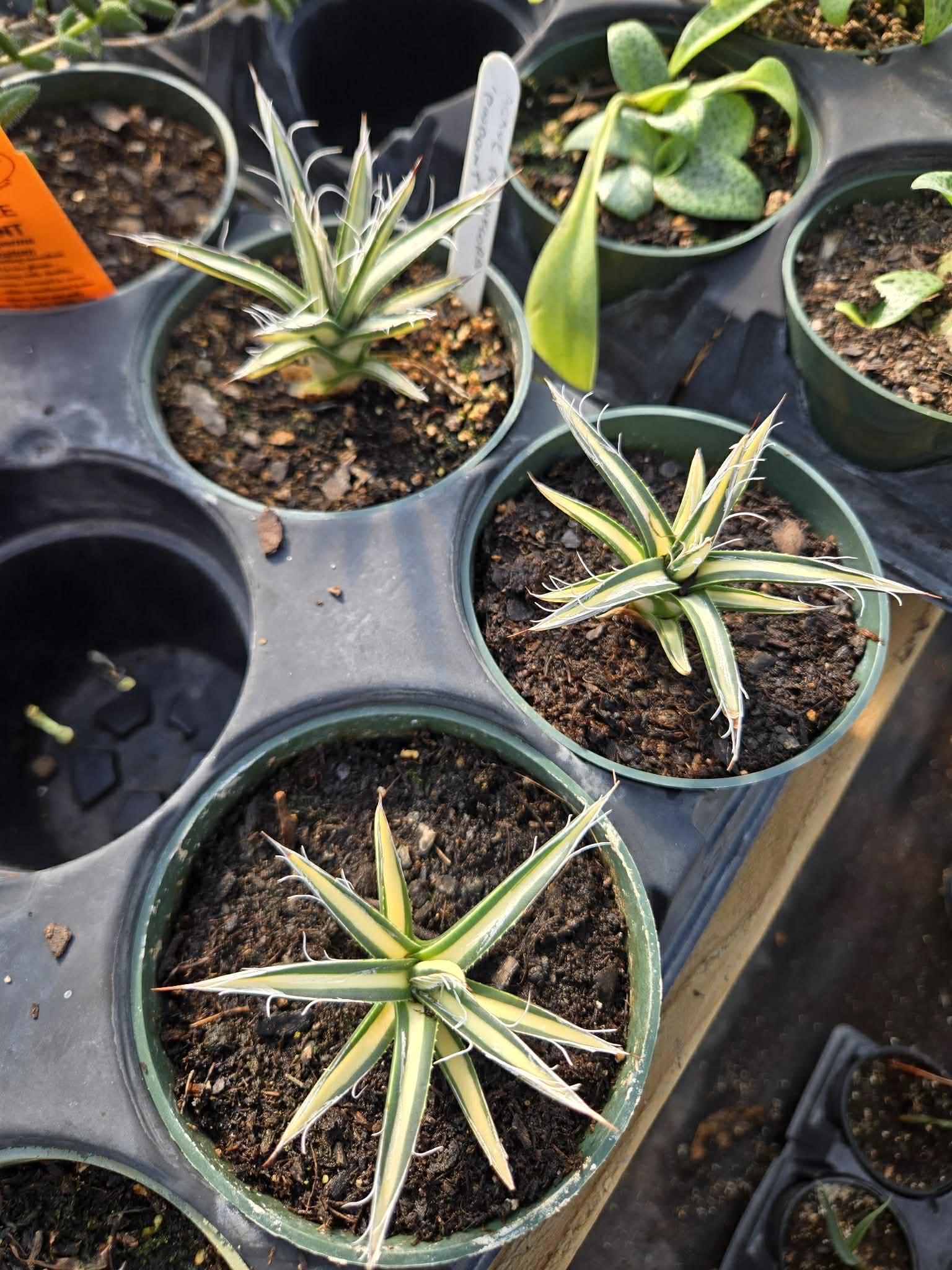 Really special dwarf variety! White-centered, green-edged leaves with curly white filaments, charming plant grows to 6" tall and 1 foot wide. Great for container, will make a 5 foot flower spike of bright golden flowers when fully mature. Drought tolerant, full sun to part shade. Allow to dry well before watering.