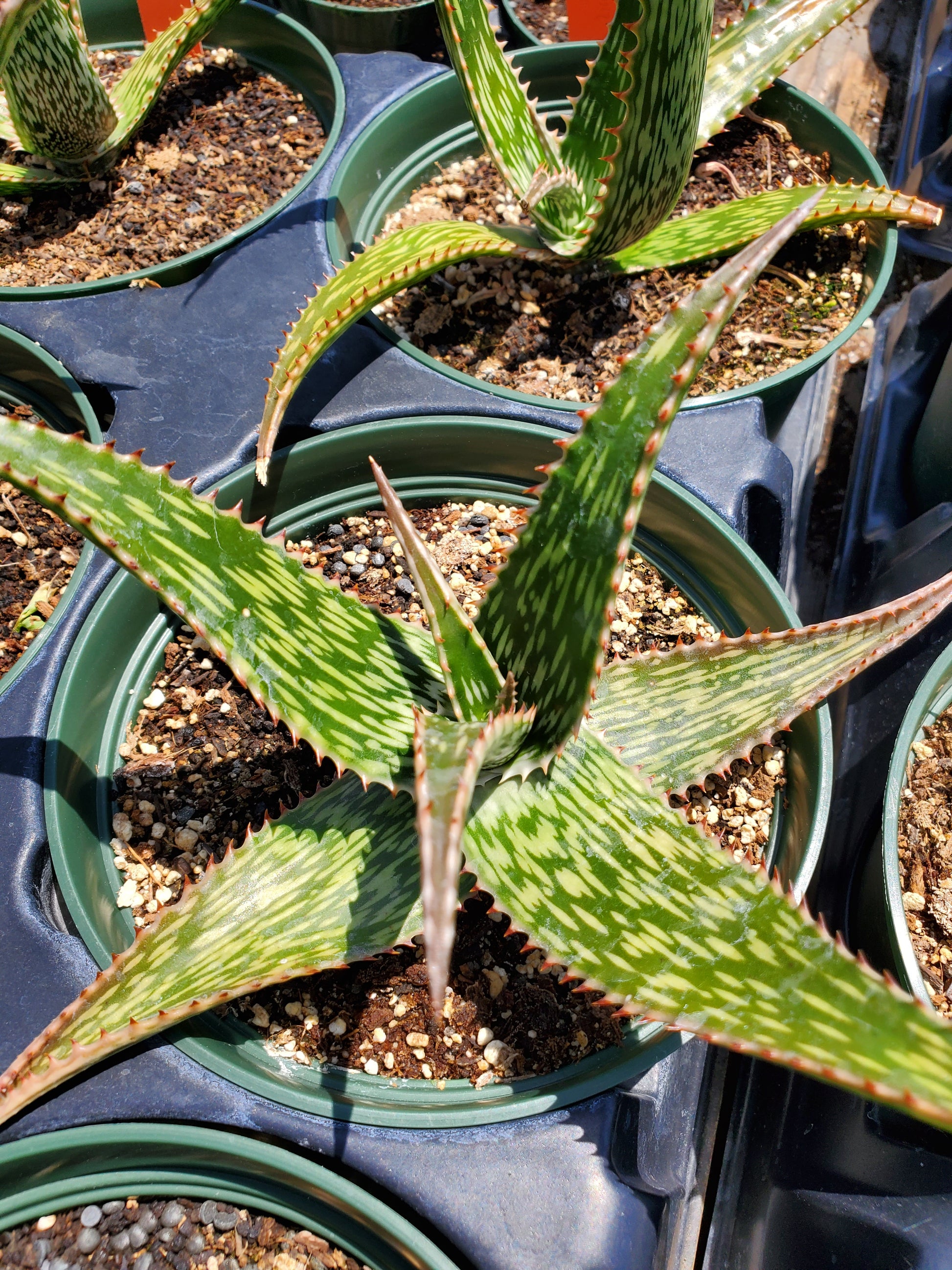 Rare and endangered Madagascar native! Rich plethora of frosty white hash marks and margin teeth make these little aloe florets look like sharp ice crystals. Will produce flower spike to 12" with rose-scarlet flowers in summer. Drought-resistant, part sun, protect from frost.