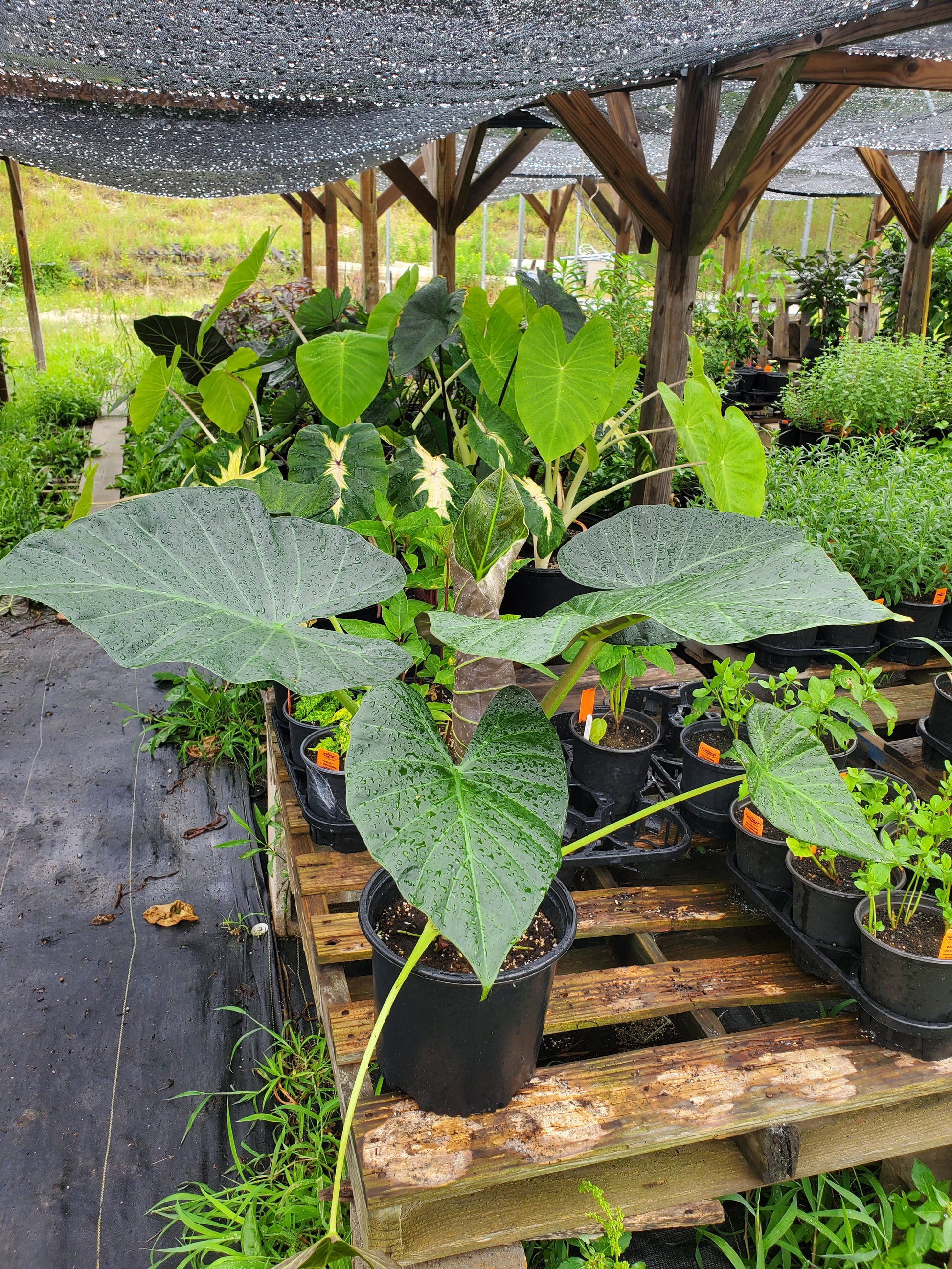 Deep green to almost black, leaves with pale green veins, growing up to two feet each! Plant can get up to 9' tall and 4' wide. Incredible statement Alocasia. Contains calcium oxalate, an irritant to humans (if consumed), and poisonous to cats and dogs. Likes plenty of light, water, and humidity, feed a few times of year for biggest growth. Protect from frost.