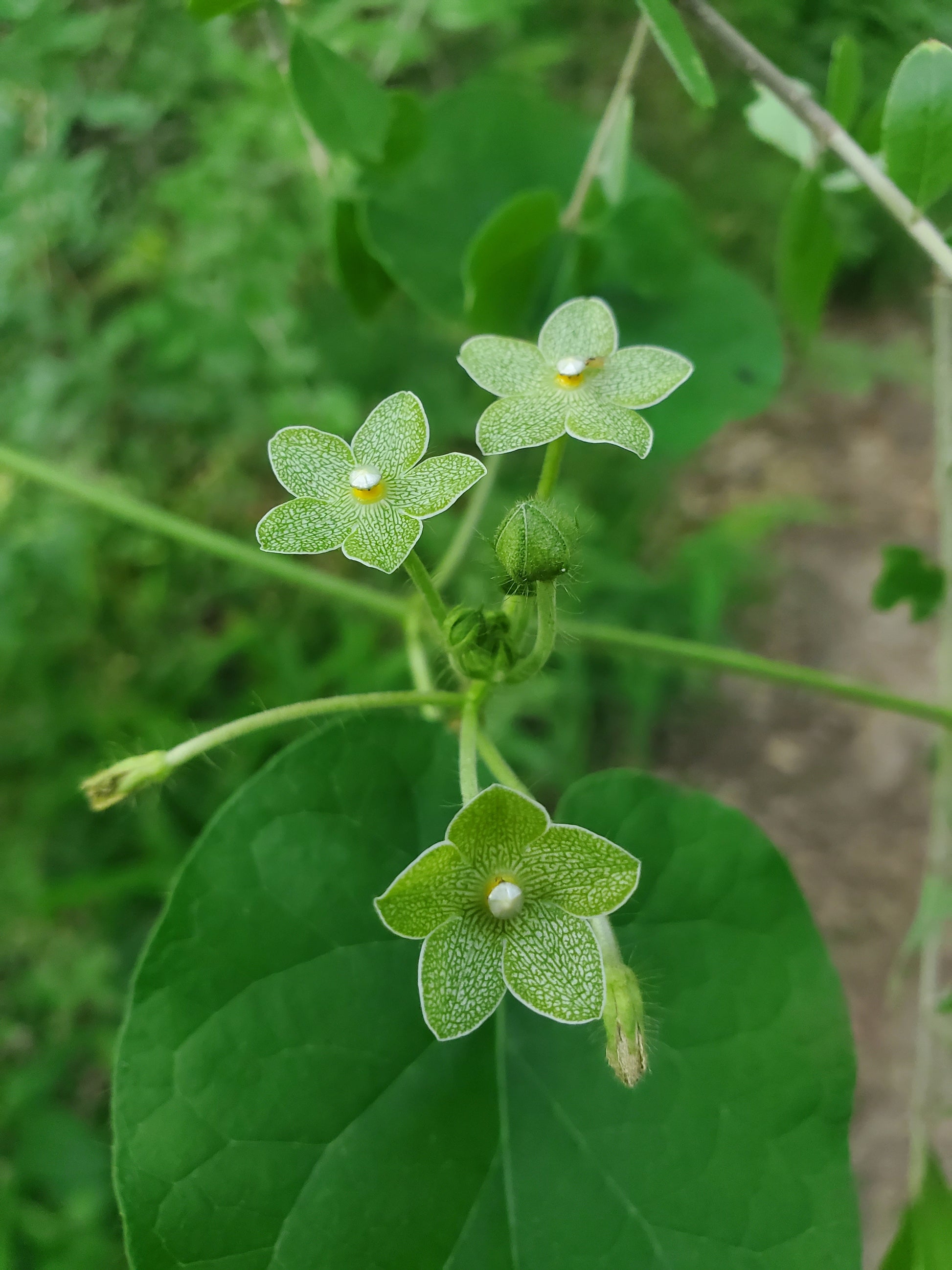 Unobtrusive yet beloved native vine, produces many small green star-shaped flowers with a pearly iridescent center. Seed pods develop in summer, covered with rather soft spikes.