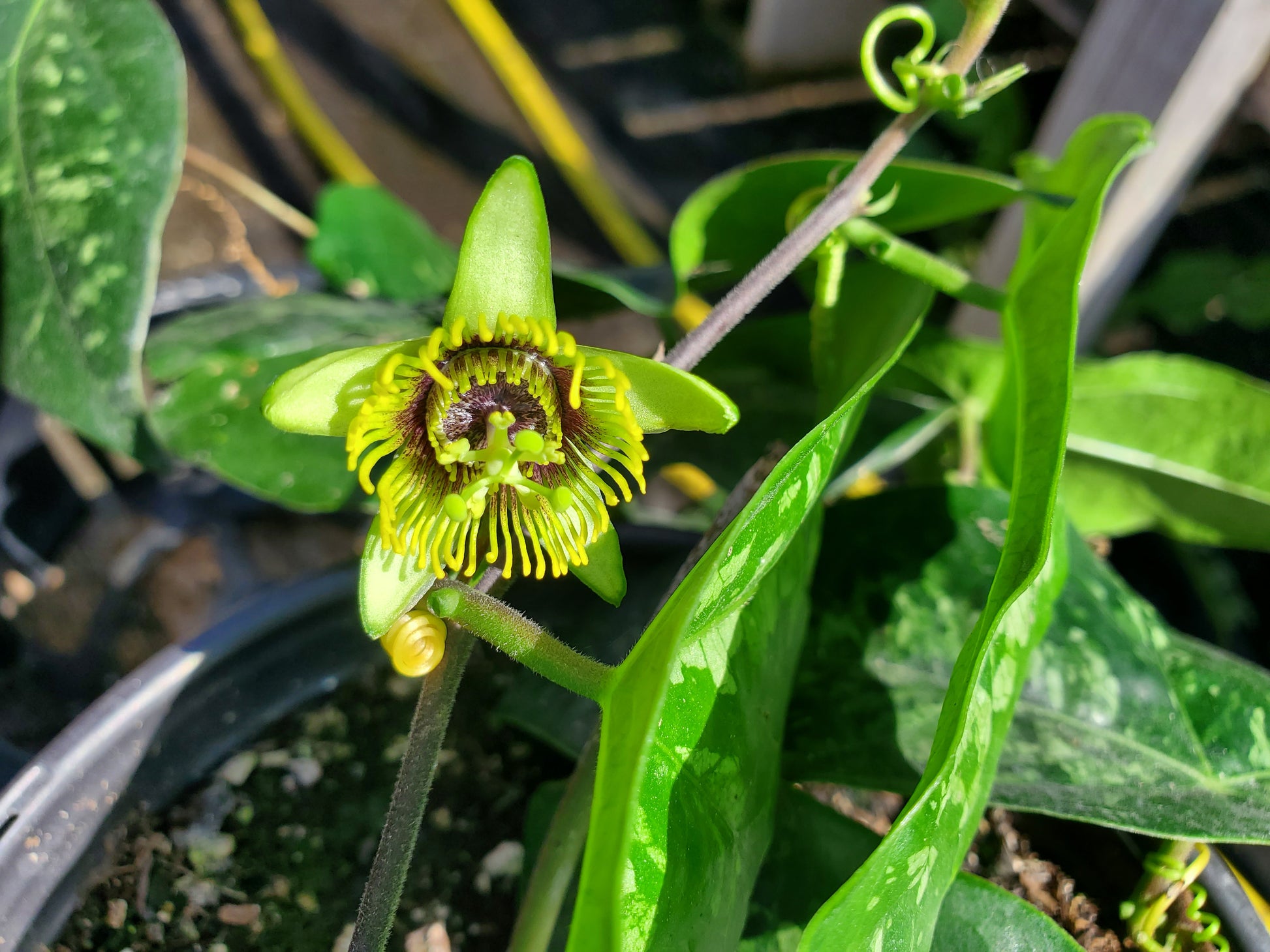 Rare! Compact for a passion vine, growing around 10' long, with small green and light purple flowers leading to dark purple ornamental fruit (non-edible). The name comes from the appearance of the leaves, double-lobed and spread like dramatic wings. Attracts pollinators and hummingbirds. Hardy through light freezes, probably root hardy in zone 8b like other passion vines. aka Passion Flower, Passionvine, Passionfruit