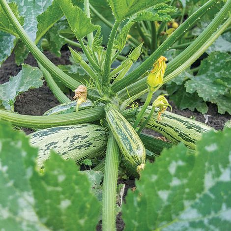 Pretty pale green squash with cream stripes, grows as a large bush, 1800s heirloom. Thin-skinned, tender, compact to fit in a smaller garden than most squash plants. Great for recipes that call for courgette or "marrow", British terms for zucchini. Accounts vary, but seems to mature between 55 and 100 days.