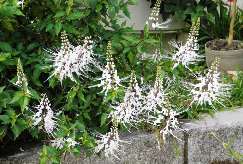 AKA "Cat's Whiskers" for the slender white filament stamens from its blooms. Medicinal herb grown widely for tea to promote kidney health in China, Indonesia, and Malaysia. Pretty and striking blooms attracts pollinators and hummingbirds. Full sun to part shade, 24" tall, keep moist. Can survive a light frost.