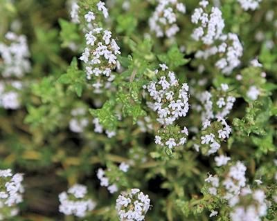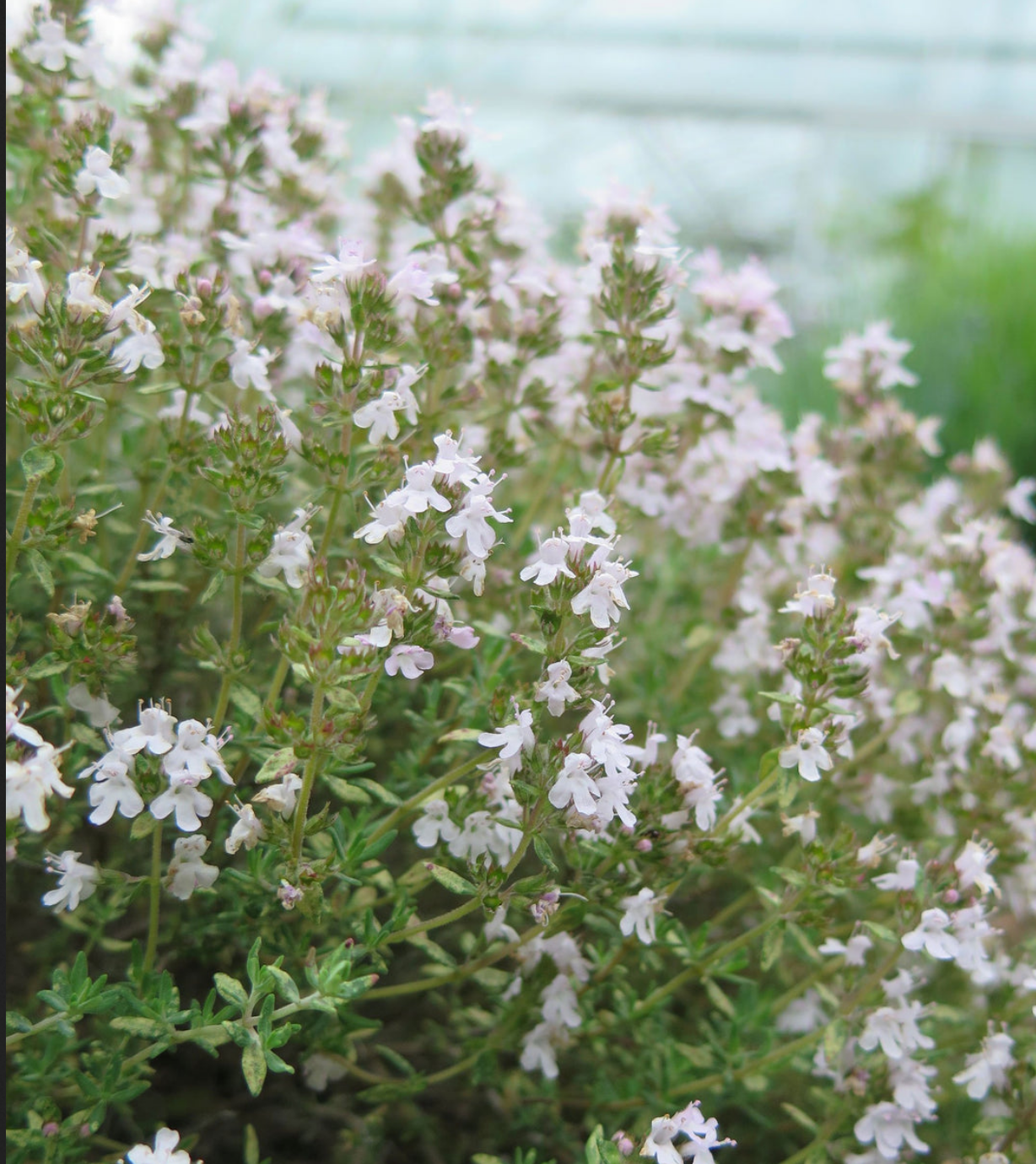 Mediterranean bushy blooming thyme. Great citrus notes, and pretty white to pale pink flowers. Great condiment or tea herb, and with medicinal properties. Full sun, dry soils. Harvest leaves before blooming for best flavor. Attracts pollinators. Cut back regularly for best bushy growth, full sun, well-drained soil.