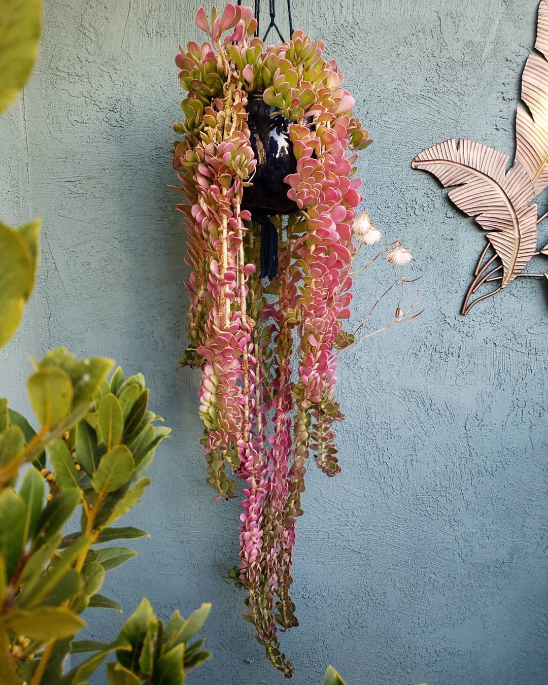 Cool creeping succulent native to Tanzania and Kenya, aka Kleinia petraea and Notoniopsis petraea. Densely growing overlapping spoon or egg-shaped leaves on dramatic trailing stems up to 4 feet. Leaves blush to pink at the tips, or an even more dramatic magenta when sun-stressed, and in early fall, produces small clusters of orange blossoms that grow upward no matter the stem angle. Similar appearance to some crassula jades, though unrelated. Well-drained, sandy soil, flush water rarely. Protect from frost. Attracts pollinators when in bloom.