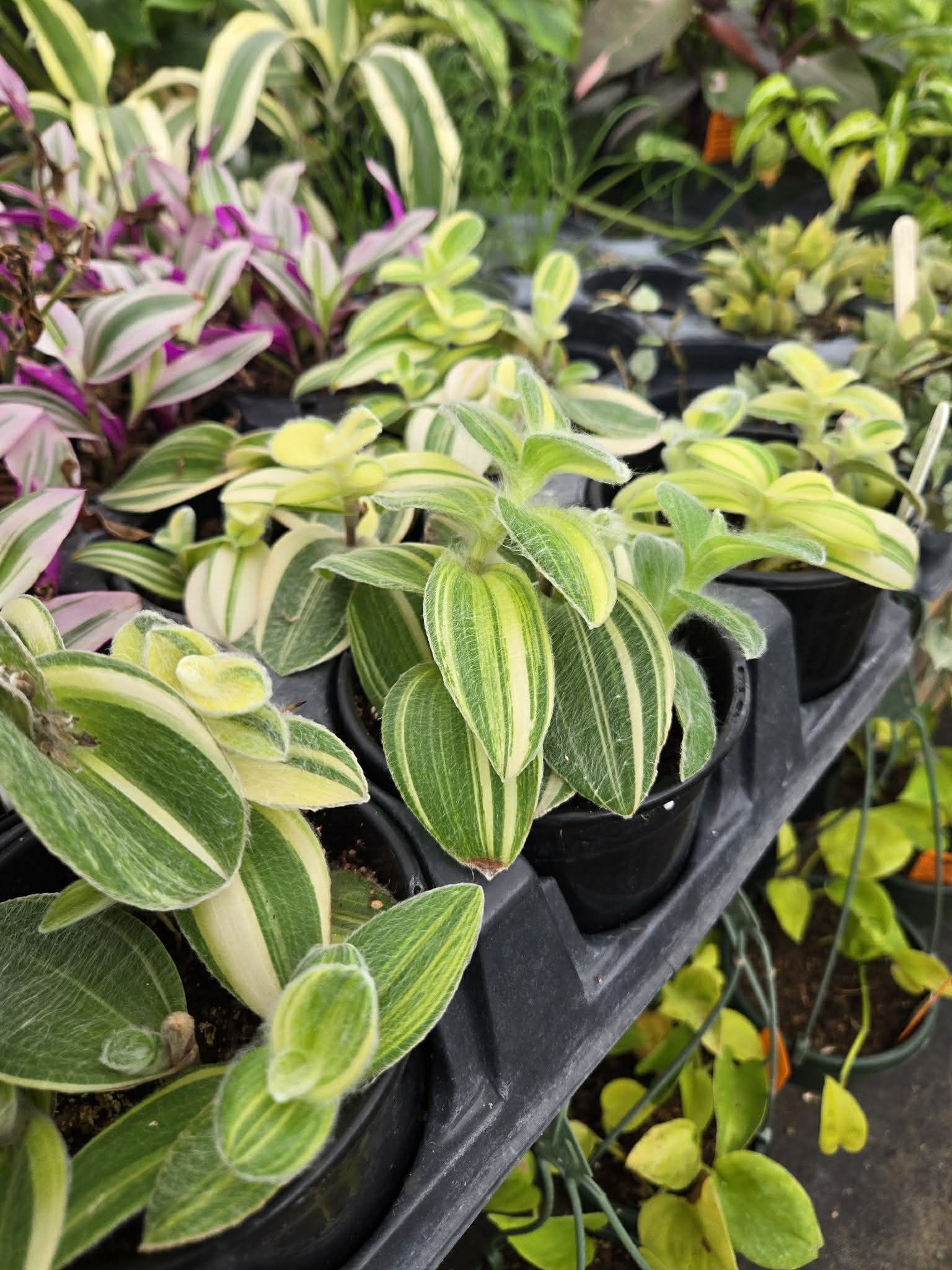 AKA Cobweb Spiderwort. Perennial spreading groundcover with broad, green and butter yellow striped leaves with white fuzzy hairs (same species as our white and purple velvet types!). Part sun to shade, extremely easy and forgiving plant.